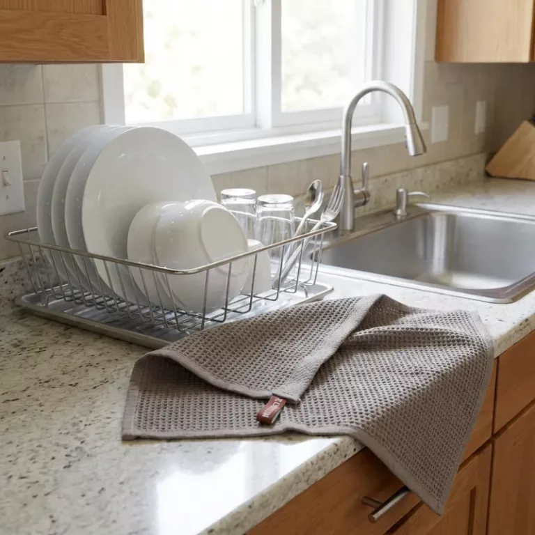 Waffelgewebtes Tuch, das Spritzer am Spülbecken in Sekunden aufsaugt.