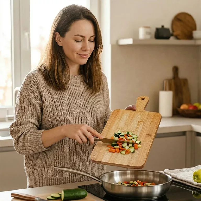Ich benutze dieses Brett zum Gemüse schneiden und trage dann alles direkt zur Pfanne. Der lange Griff liegt stabil in der Hand und hält meine Hände von der Hitze fern.