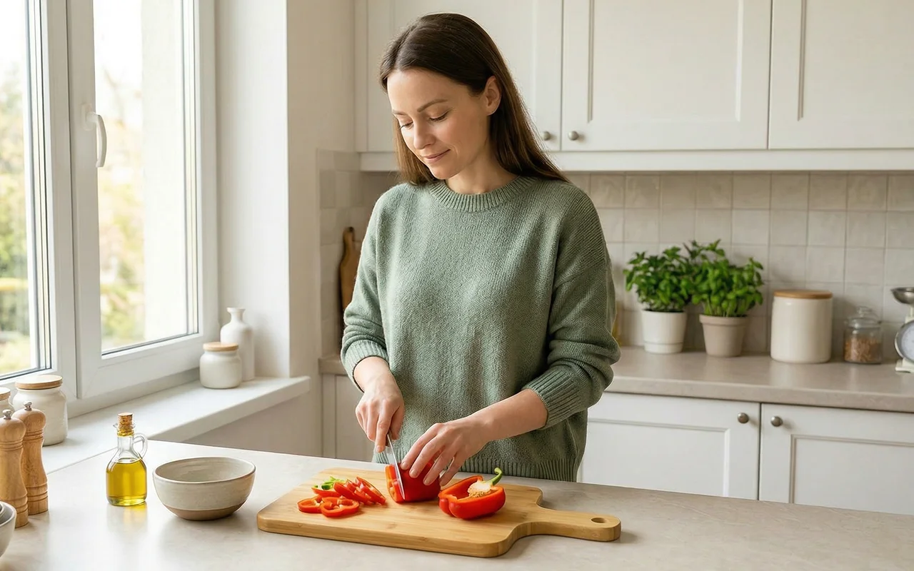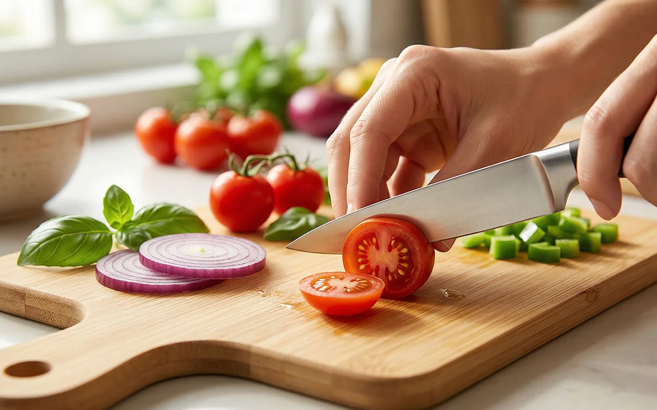 Kochen fühlt sich einfacher an, weil die Zutaten auf dem Nygex-Brett geordnet bleiben. Der praktische Griff hilft, geschnittene Lebensmittel ordentlich direkt in die Pfanne zu geben.