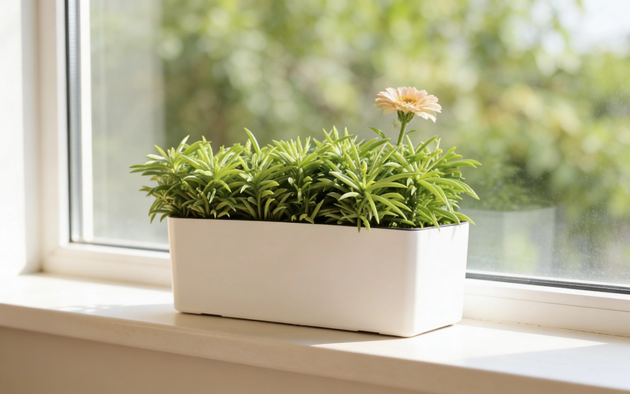 Ich habe diesen Pflanztopf auf meiner sonnigen Küchenfensterbank, und das Wasserfenster rettet meine Kräuter. Basilikum bleibt üppig, selbst wenn es bei der Arbeit stressig wird.