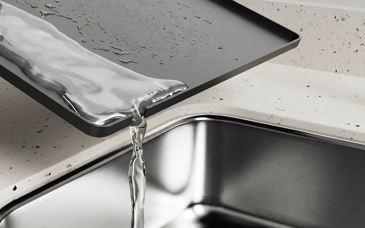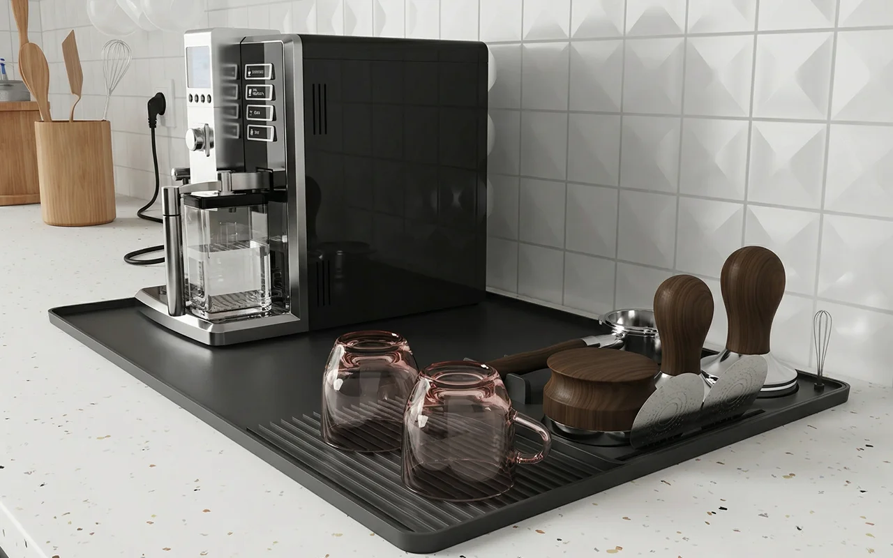 Die Nygex-Kaffeimatte fängt Spritzer auf, damit Arbeitsflächen länger glänzend bleiben. Heben Sie die Matte einfach an und lassen Sie die gesammelte Flüssigkeit sauber über den cleveren Eckausguss ab.