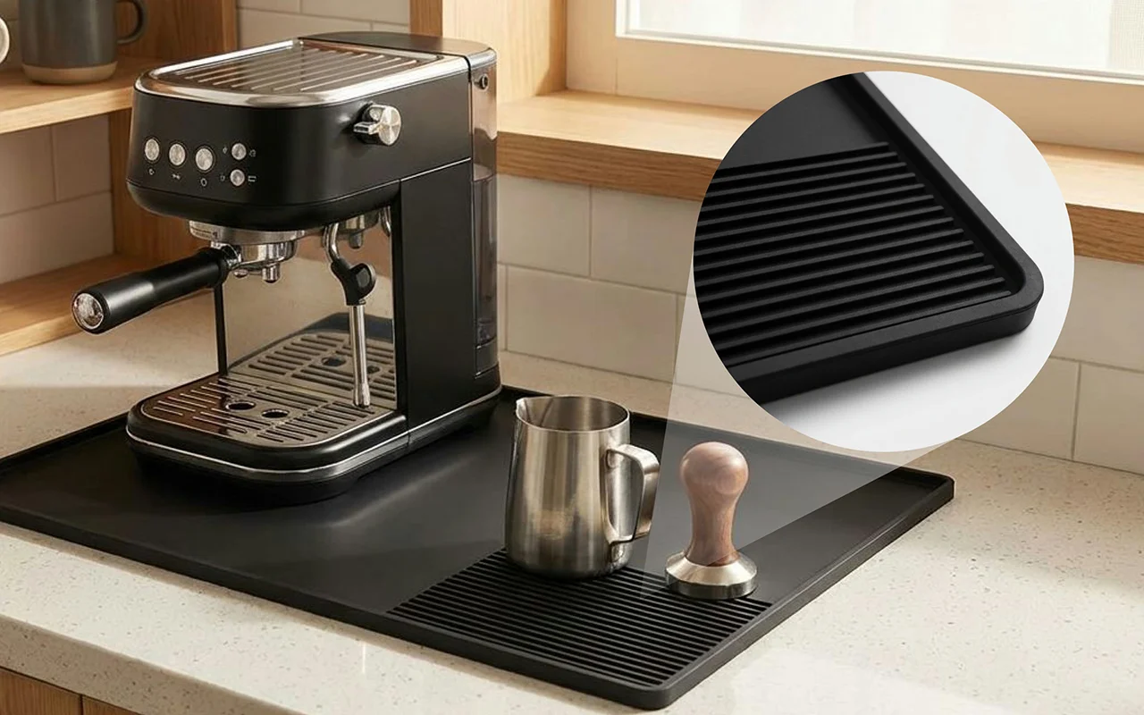Die Nygex-Kaffeematte hält Tamper, Filter und Kännchen sicher neben der Maschine. Spezielle Rillen halten das Zubehör fest, sodass die Getränkezubereitung sich jedes Mal angenehm glatt anfühlt.