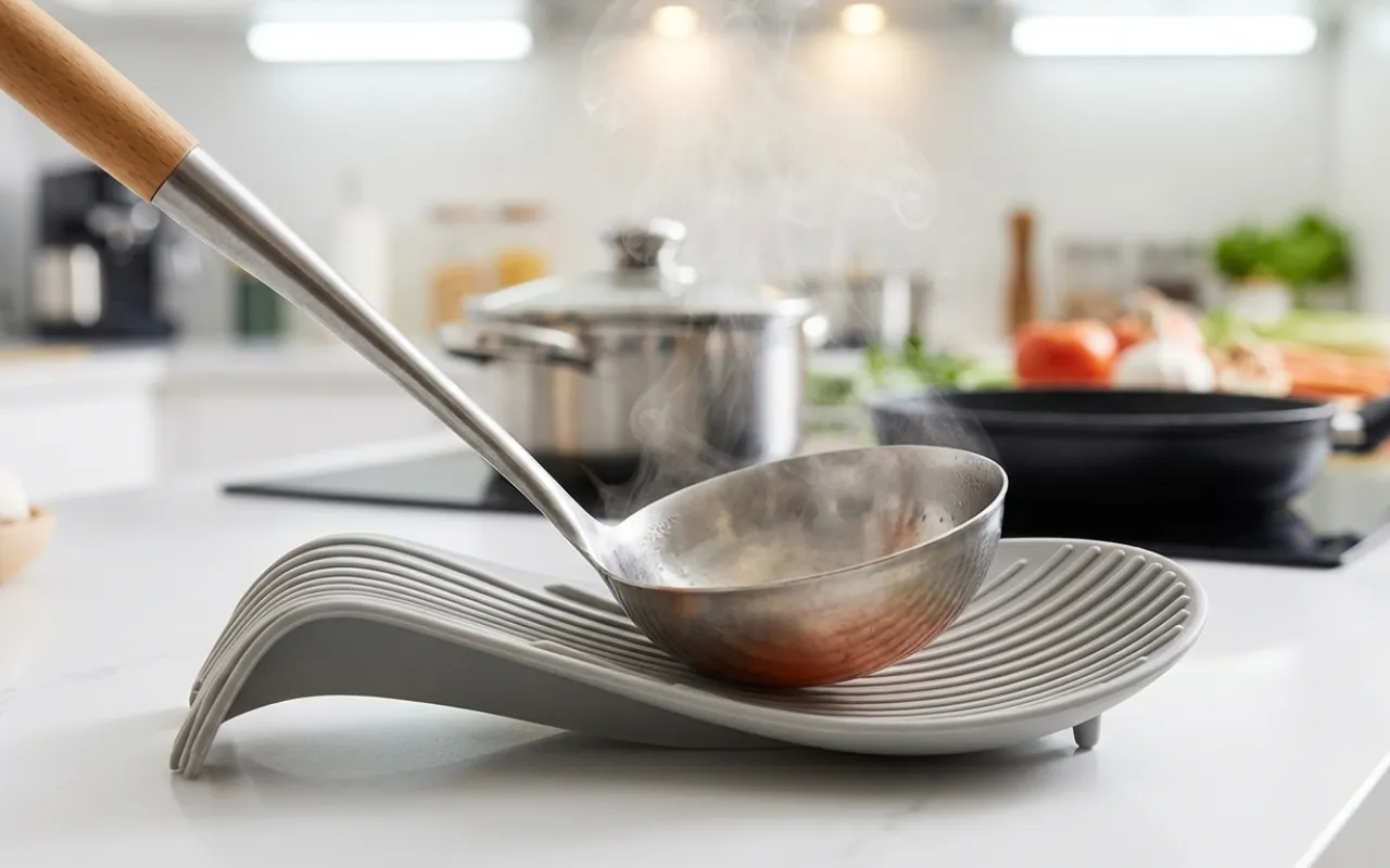 Vielbeschäftigte Köche hassen klebrige Ringe unter tropfenden Servierutensilien. Der Nygex-Silikonhalter fängt Soßen ordentlich auf und schützt empfindliche Arbeitsflächen wirkungsvoll. Das hitzebeständige Design hält auch zischend heiße Kellen sicher aus und verhindert plötzliche Verbrennungen. Erhöhte Rillen heben das Besteck über Pfützen an und halten Griffe länger frisch.