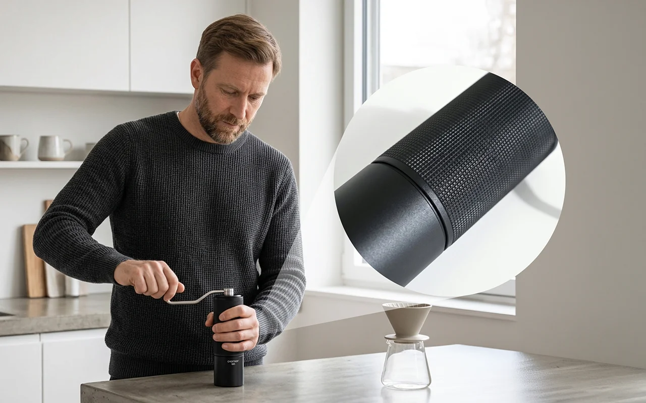 Die rutschfeste Struktur macht einen riesigen Unterschied, wenn meine Hände etwas nass sind. Ich kann sie festhalten und genug für eine ganze Kanne mahlen, ohne müde zu werden.