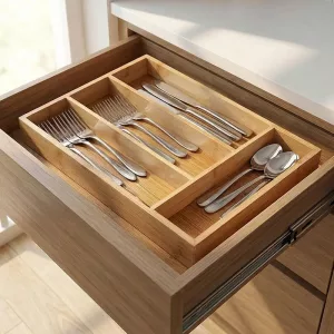 Das glatte Bambus fühlt sich sanft zu meinen guten Messern und Serviergabeln an. Es klappert nicht wie altes Plastik, und der natürliche Look bringt ein bisschen Spa-Ruhe in die Schublade.