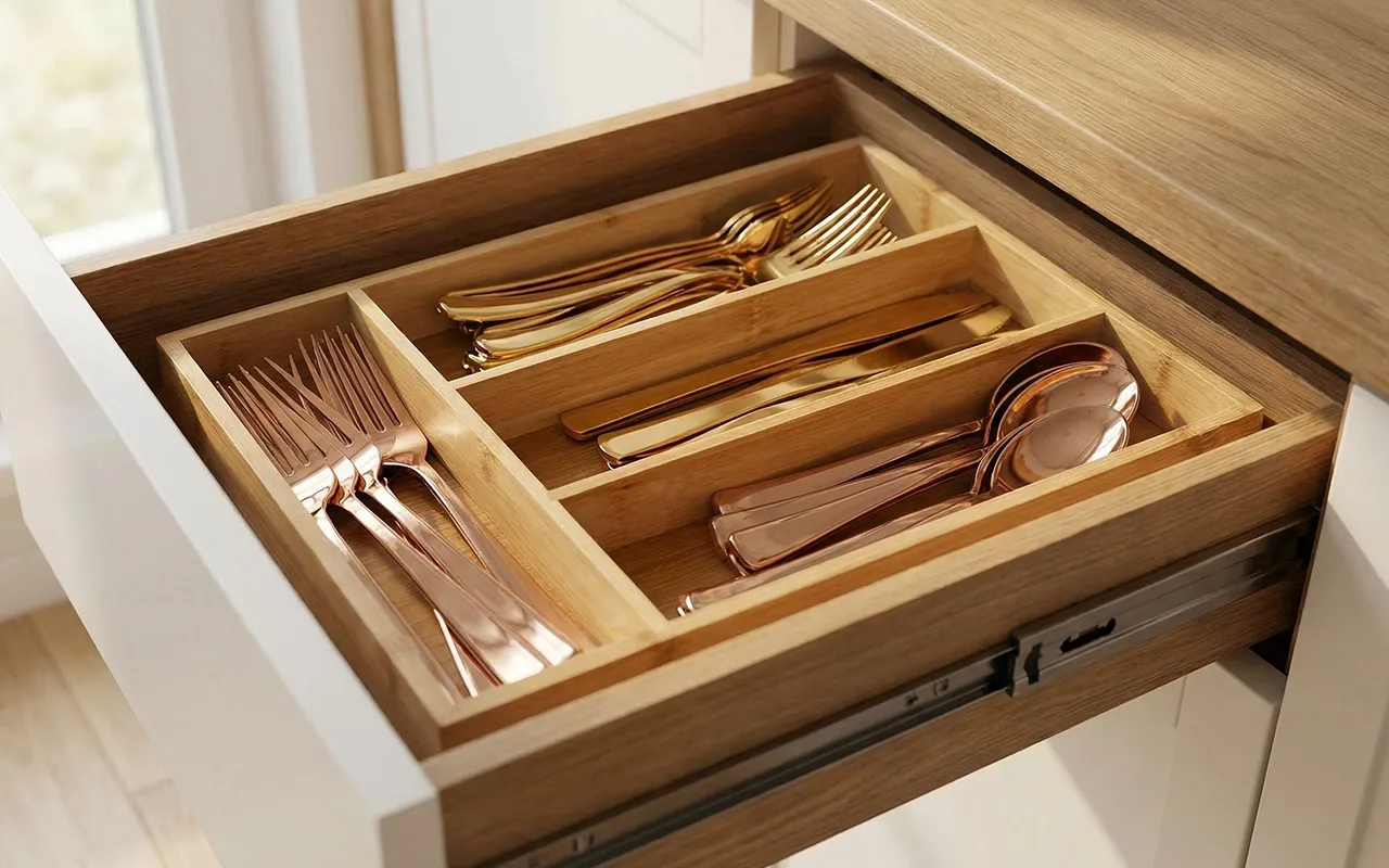 Dieser einfache Bambuseinsatz macht das Decken des Tisches schneller. Ich ziehe die Schublade auf und sehe sofort, was knapp wird, statt nach fehlenden Teelöffeln zu suchen.