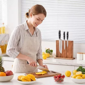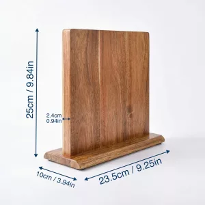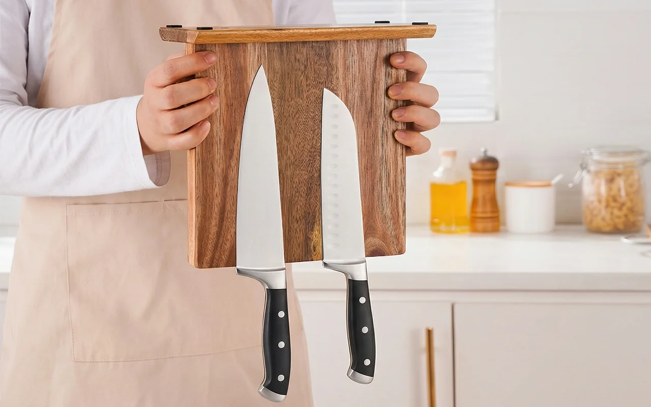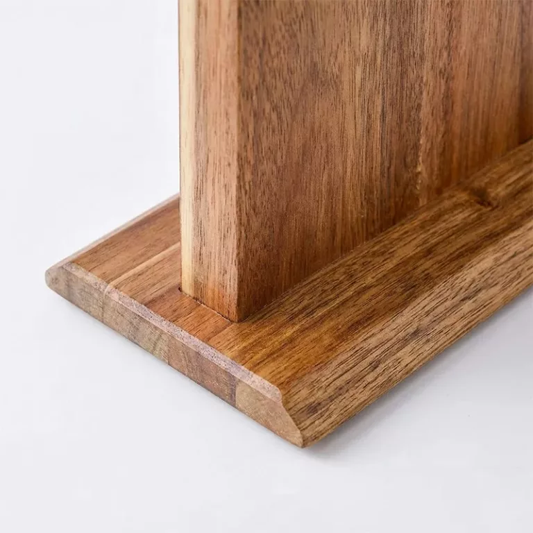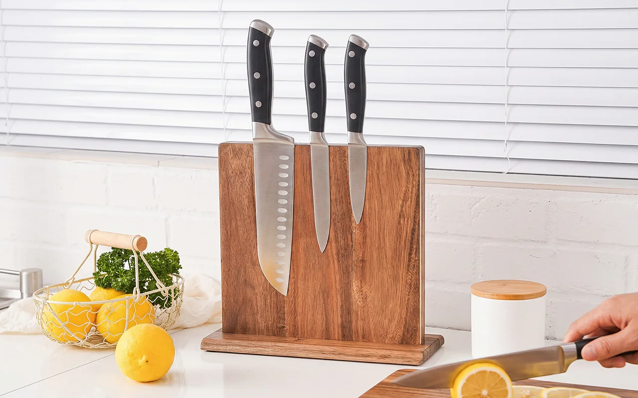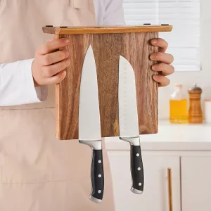 Der Nygex-Holzständer räumt überfüllte Schubladen und unordentliche Arbeitsflächen im Handumdrehen auf. Starke, versteckte Magnete halten die Klingen fest, während die Schneiden perfekt scharf bleiben. Die glatte Akazienoberfläche ist kratzfest und lässt sich nach dem Kochen einfach abwischen. Die natürliche Maserung passt zu modernen Küchen und schafft eine ruhige, aufgeräumte Vorbereitungszone.