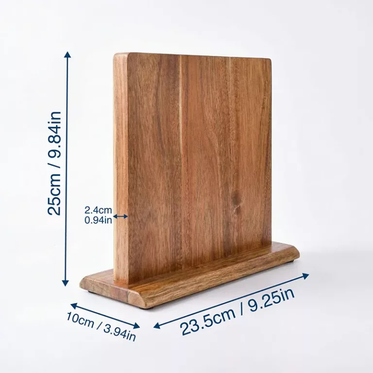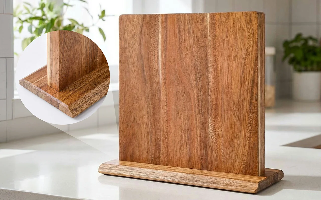 Ich liebe, wie stabil dieser Ständer wirkt. Die versteckten Magnete halten mein schweres Kochmesser problemlos, und die abgerundeten Ecken sind sicher für Kinder.
